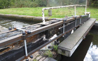 The top gate beam on the lock had finally snapped in two, but instead of being replaced I gather had angle iron fixed to hold it together, as the one in the picture an now normal. But the problem is how long will it last?