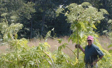 It is the sap that can cause blistering and burns to skin when exposed to sunlight, and the plant cannot be chopped down, but has to be carefully removed and burnt.