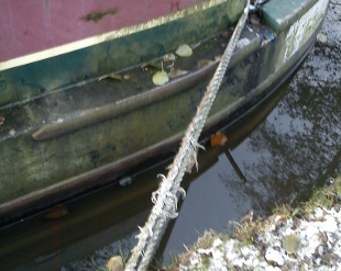 The centre rope has burnt away—the boat is held there by the shredding bow and stern ropes. If it goes—it will be when a boat is passing it. I emailed BW about the boat the following day asking them to move it because it was a potential danger to the navigation on the Whaley Arm.