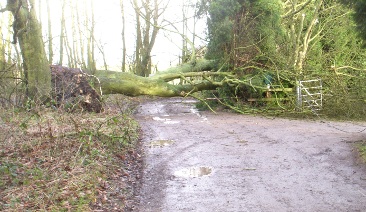 Situated in woodland a mile from a tarmac road, the power cables are slung amongst the trees by the side of the tracks, and wind took out a very large sycamore tree that landed on the power cables with its weight pulling over the poles and ripping the fitting until the wires snapped. The picture below shows the snapped cables on the ground.
