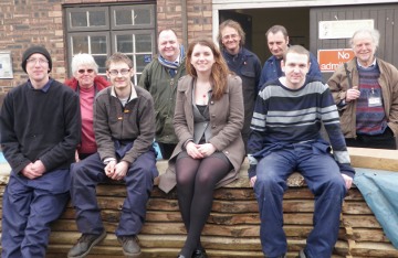 From left to right in the picture: Huw Williams, trainee, Di Skilbeck, volunteer, Mark Andrews, trainee, John Inch, General Manager, Alison McGovern MP, Dave Linney and John Moore, Heritage Boatyard, Andy Deer, trainee and Mike Turpin, volunteer, at the National Waterways Museum's Heritage Boatyard.