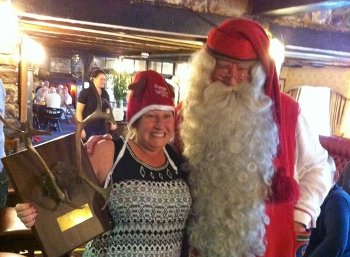 After stopping off at a number of pubs along the way, he returned to the Coach & Horses to present Tracey Birch a five star Santa Award for best pub in Britain. (Pictured together.) Only one other establishment in the country has this award—a three star Santa Award in Dorset.