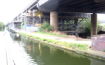 I notice that the M6 at Spaghetti is falling down, with contractors very hard at it attempting to make it safe. The age old problem with concrete and steel reinforcing is that once water or air gets to the steel it starts to rust, and like those Walls of Jericho, things tend to take a turn for the worse. The reason for all those sensors on the pilings that you can see from the waterways tell if things are not as they should be. The contractors had pipes into the canal with buoys keeping us away but sending us into the offside bushes. If they were taking our water, surely they could have sucked it up from the river below. Mind you, as far as I could see there was little shortage.