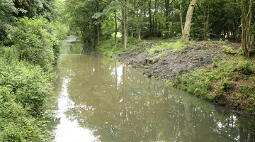The most recent restoration work focused on a section of canal next to the entrance to the Three Compasses pub, located by Dunsfold Road at Alfold, which is the summit pound (pictured) of the whole canal, running along the edge of Dunsfold Park.