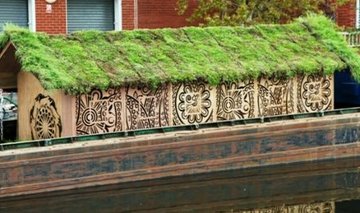 The boat that represents a terraced house with a grass roof, started its journey at Blackburn and is travelling East along the Leeds & Liverpool Canal.
