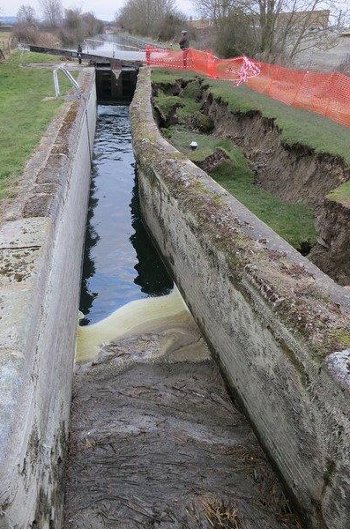 In my view the strong likelihood is that the collapse is of a lock not built as solidly as some in the first place, and very likely the very wet weather of the last few years, resulting in far more water in the surrounding soil, has alone been enough to cause it, and that neither long established bollards or the much newer dairy construction are likely to be implicated.
