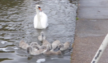 The hole is getting bigger between the bottom gates of Shardlow Lock, but as one of the smaller of the dreaded six, it doesn't make too much difference. It was here in the lock we again met the pair of swans with nine signets, and only hope they don't make an habit of it, especially when two boats are in the lock. But of course people, and particularly some boaters feed them bread. Now me, I believe bread is hardly their stable diet, so don't, but of course Jan did, as the result can be seen.