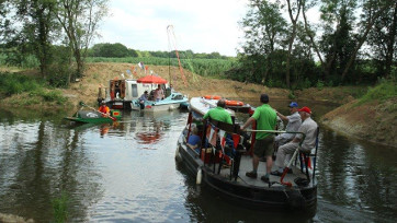 The lock was originally built between 1813 and 1816 but was demolished in the 1930s when the canal had fallen into disuse, and many of the bricks were reused on other local building projects. The photograph shows boats using the newly open section of the waterway.