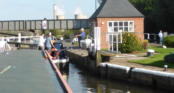 The first manned lock on that glorious Sunday was of course Radcliffe Lock, that took us 44 minutes—there were two plastic jobs and a small narrowboat that they seemed terrified off, with the plastic boats shuffling around to get a place, then tie up with two ropes each, coming down the lock, a lock that all of you who have used it will know has no turbulence whatsoever when being emptied. And of course they let the water out oh so slowly, mind you the ever leaking gate did help.