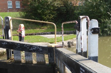 The picture shows the now normal sight on the Leicester Section of leaking water from the top gates as a lock is entered, though often balanced by similar leakage at the bottom gates, though not in this particular case—and all the paddles were firmly closed.