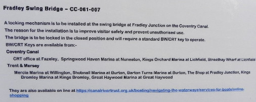 THE result of Canal & River Trust now locking Fradley Swing Bridge after Mick Fitzgibbons pointed out in narrowboatworld its danger to the children playing on it, it is now to be locked closed.