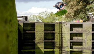 However the canals are hardly the right place for such an activity, for racing towards a lock and slinging himself over closed lock gates into a empty chamber could have dire consequences should a narrowboat have pulled in whilst he was preparing... He is shown leaping over the gates of Camden Lock into the empty chamber.