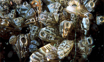 Zebra Mussel. Due to its filtering capacity and ability to produce dense populations, it can significantly reduce native biodiversity, and alter whole freshwater ecosystems. It is also a nuisance and economic problem when growing in pipes of water treatment plants. It forms dense colonies and can be found in both flowing and standing water bodies.