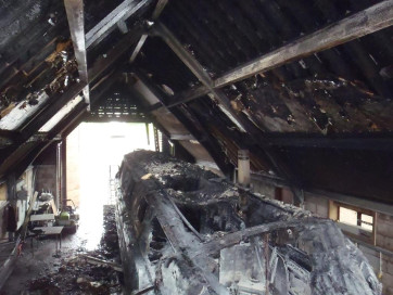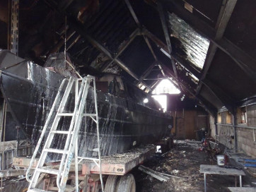 A narrowboat was being repaired in the workshop when a fire started in the battery compartment owing to a fault in the wiring, it seriously damaging the boat and spreading to the building that was extensively damaged in May of 2013. A man and woman living on the boat escaped the fire but suffered the effects of smoke inhalation, requiring attention by paramedics. (Photographs by courtesy of Lancashire Fire and Rescue Service.)