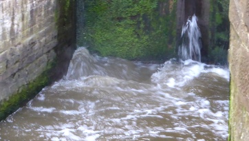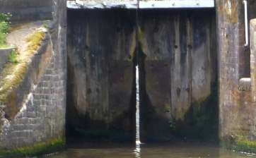 On one particular lock, the top gate leaked, and once again the bottom gate leaked so much when we attempted to fill the lock that it just would not fill, so it needed all of us to get the top gate open against the water pressure. Here's a picture of the leaking bottom gate. And again at the start of the season!