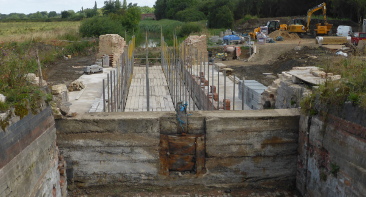 The ‘before' picture below (photographs by D Cross) was taken at the end of June whilst preparations were being made for the first of four pours of concrete to provide the wall supports. The mass concrete came from Newark Concrete, part of the Tarmac Group, in big wagons and not from the little cement mixer! However, note the position of the cement mixer as a point of reference!