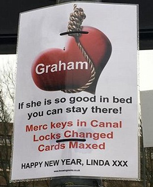 It seems Graham has been a naughty boy and cheated on his lover Linda, and being a woman scorned, she has taken revenge by throwing his keys—including those to his car—in the Grand Union Canal, and plastering Warwick with laminated posters.