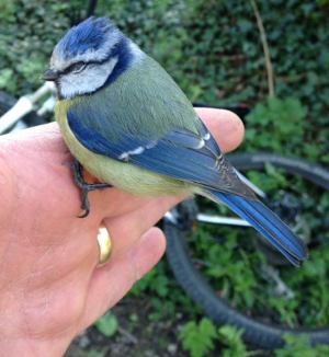 He was cycling along from Tapton Lock towards his home when he espied a small bird sat in the middle of the towpath. Not wanting to cause it harm he dismounted and attempted to get it to move, but to no avail, the blue tit just stood there looking at him.