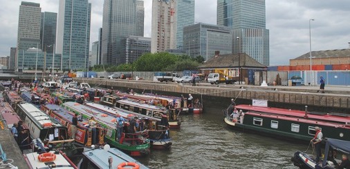Just a few of the 100 narrowboats that arrived at West India Dock, Docklands today (Friday) for scrutineering before the Diamond Jubilee Pageant on the Thames on Sunday.